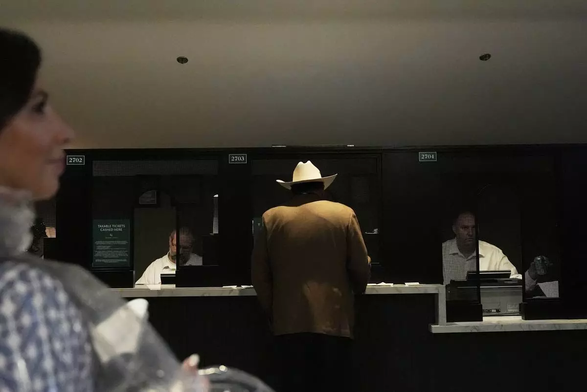 A person places a bet at Churchill Downs before the 151st running of the Kentucky Derby horse race Saturday, May 3, 2025, in Louisville, Ky. (AP Photo/Brynn Anderson)