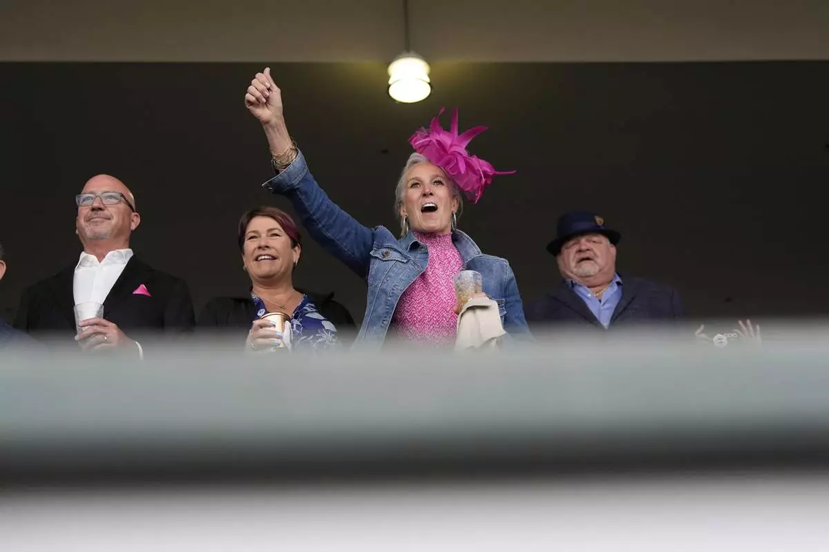 Melissa Ortiz reacts as she watches a race at Churchill Downs before the 151st running of the Kentucky Derby horse race Saturday, May 3, 2025, in Louisville, Ky. (AP Photo/Charlie Riedel)