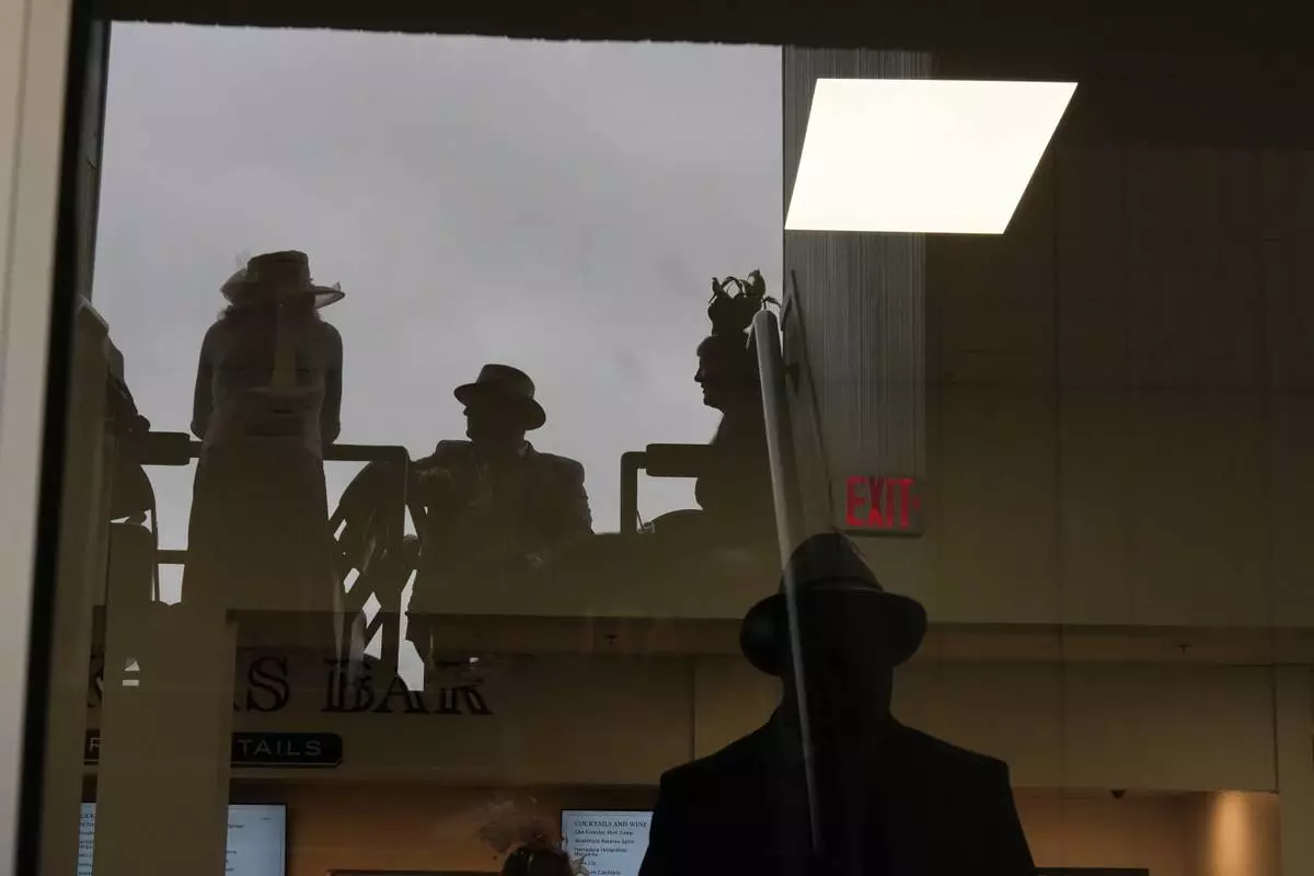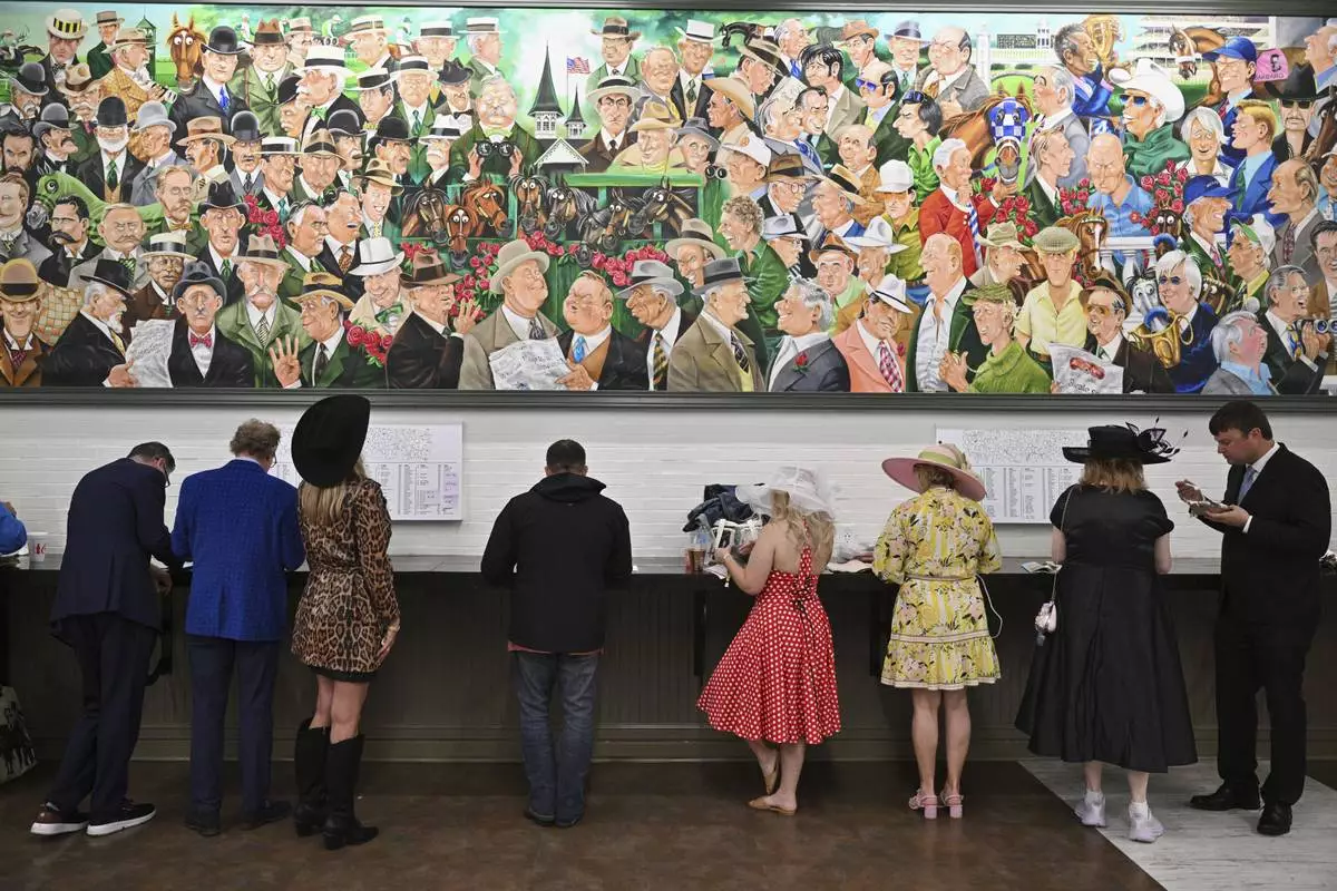 People stand against a wall at Churchill Downs before the 151st running of the Kentucky Derby horse race Saturday, May 3, 2025, in Louisville, Ky. (AP Photo/Jon Cherry)