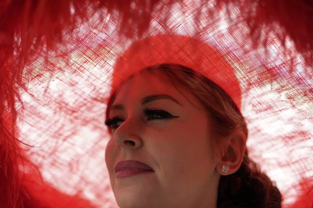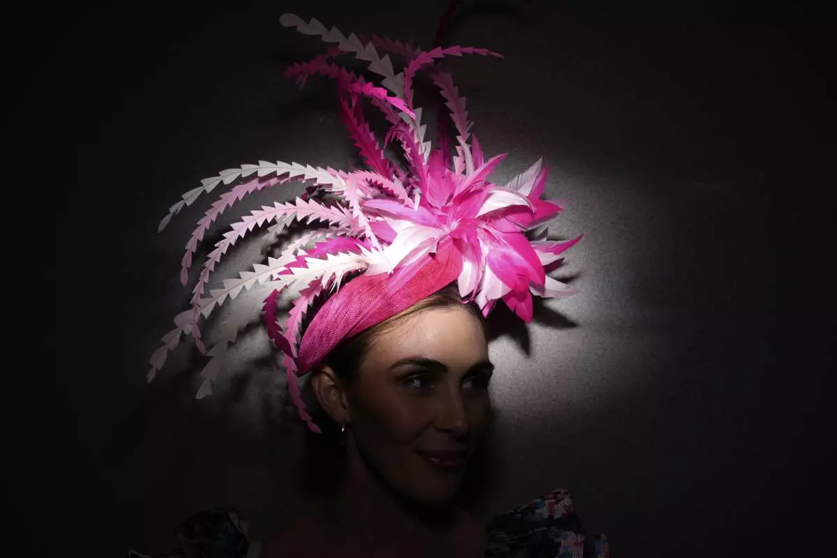A woman wears a hat while roaming the grounds at Churchill Downs before the 151st running of the Kentucky Derby horse race Saturday, May 3, 2025, in Louisville, Ky. (AP Photo/Brynn Anderson)