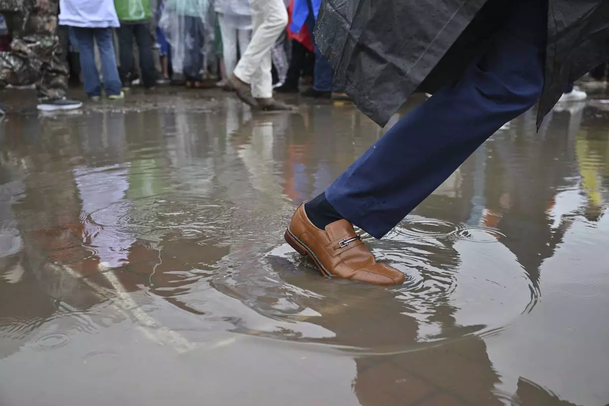 A race fan walks through a puddle at Churchill Downs before the 151st running of the Kentucky Derby horse race Saturday, May 3, 2025, in Louisville, Ky. (AP Photo/Jon Cherry)