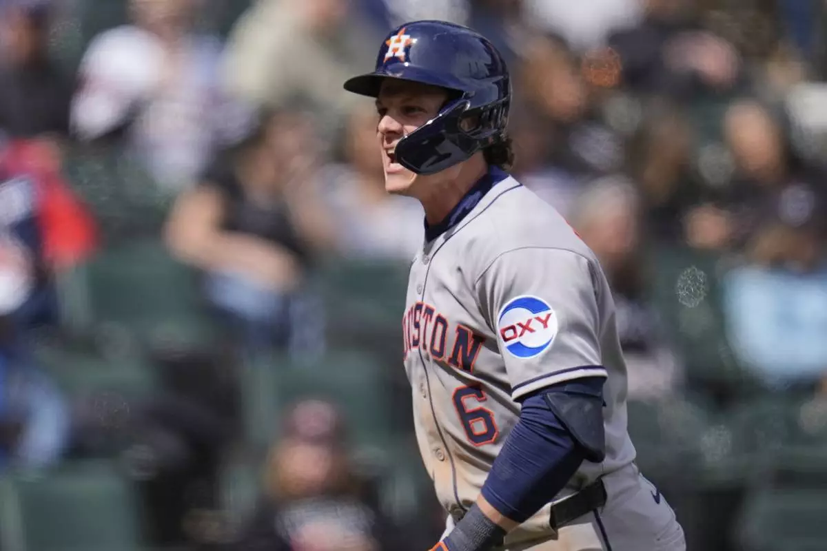 Houston Astros' Jake Meyers (6) gestures after hitting a double during the eighth inning of a baseball game against the Chicago White Sox, Saturday, May 3, 2025, in Chicago. (AP Photo/Erin Hooley)
