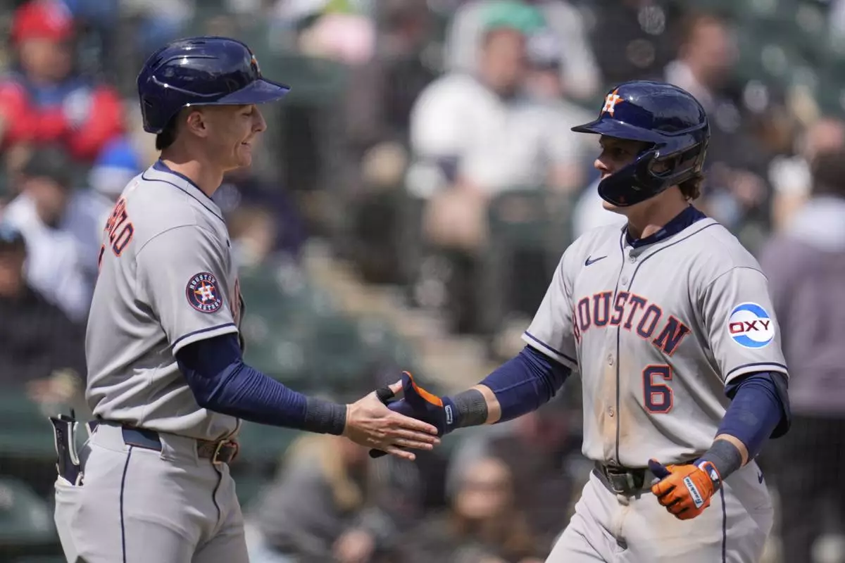 Houston Astros' Jake Meyers (6) slaps hands with Zach Dezenzo after Meyers hit a 3-run home run during the sixth inning of a baseball game against the Chicago White Sox, Saturday, May 3, 2025, in Chicago. (AP Photo/Erin Hooley)