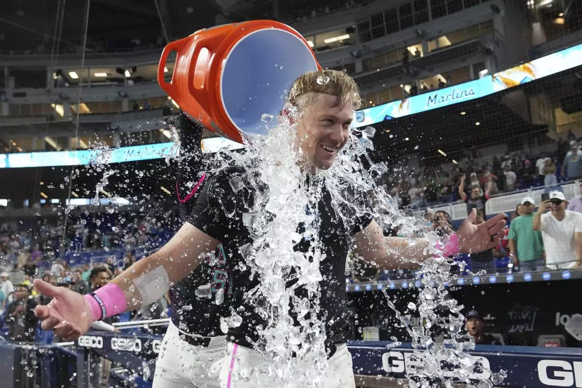 Miami Marlins' Kyle Stowers is doused with ice after hitting a walk-off grand slam in the ninth inning of a baseball game against the Oakland Athletics, Saturday, May 3, 2025, in Miami. (AP Photo/Lynne Sladky)