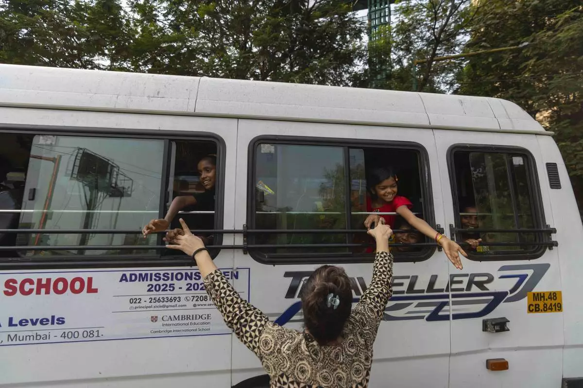 Teacher Shaila Desale says goodbye to her students as they leave the Signal Shala school in a school bus in Thane near Mumbai, India, April 3, 2025. (AP Photo/Rafiq Maqbool)
