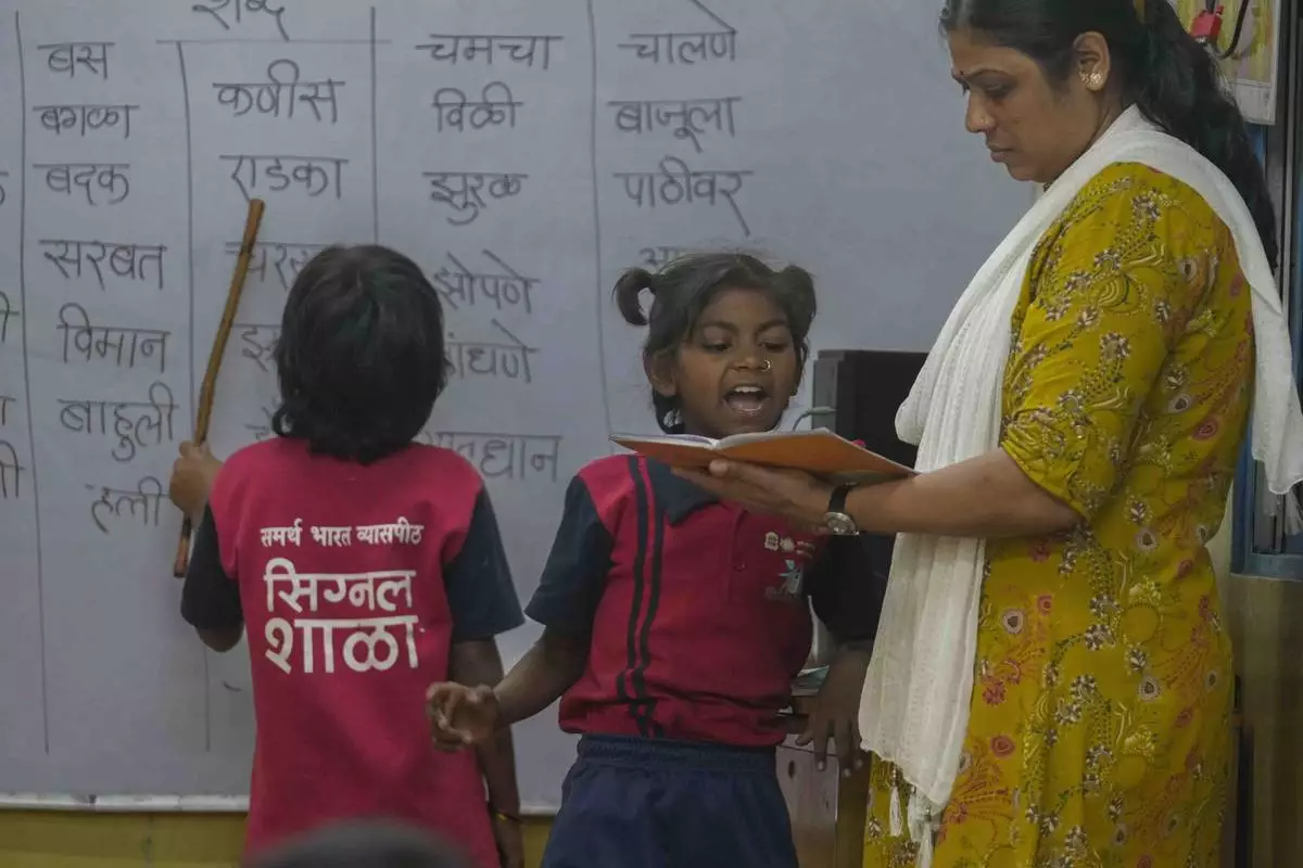 Teacher Sunita Patil checks the notebook of 10-year-old Vaishali Pawar, center, at the Signal Shala school in Thane near Mumbai, India, April 3, 2025. (AP Photo/Rafiq Maqbool)