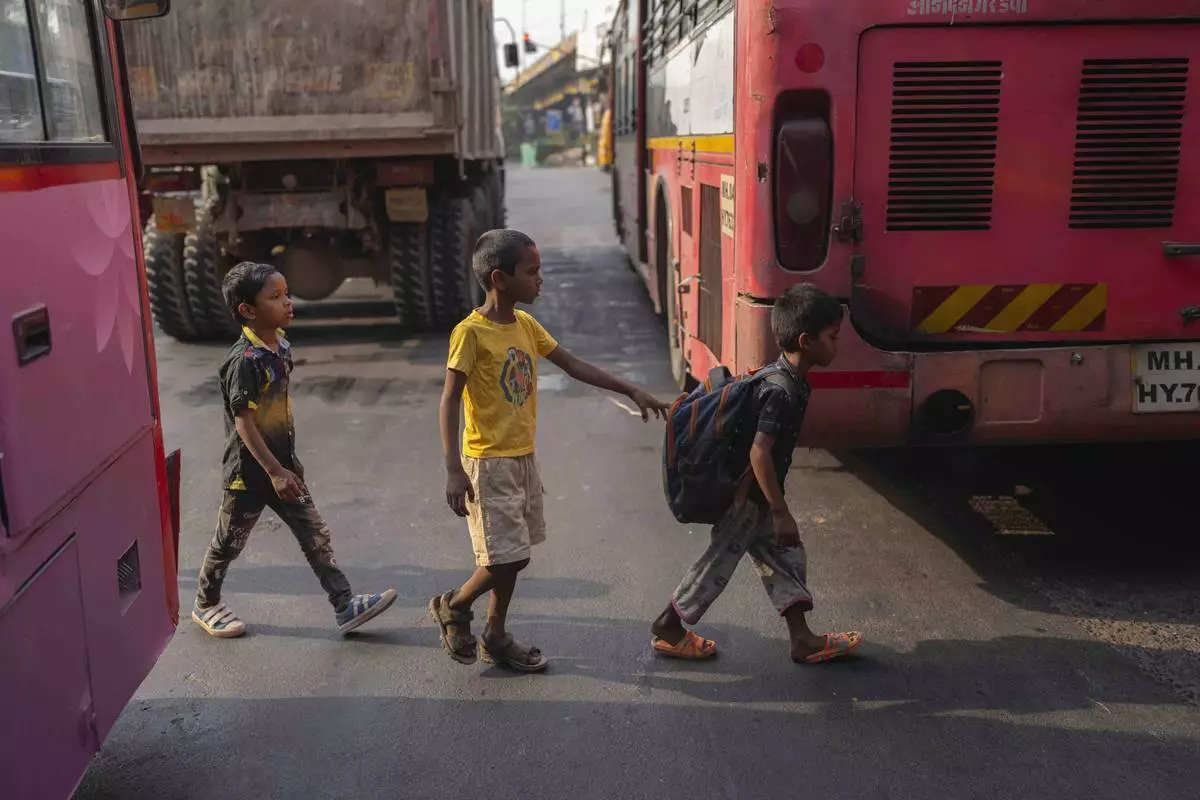 Boys cross a busy highway to reach the Signal Shala school in Thane near Mumbai, India, April 9, 2025. (AP Photo/Rafiq Maqbool)