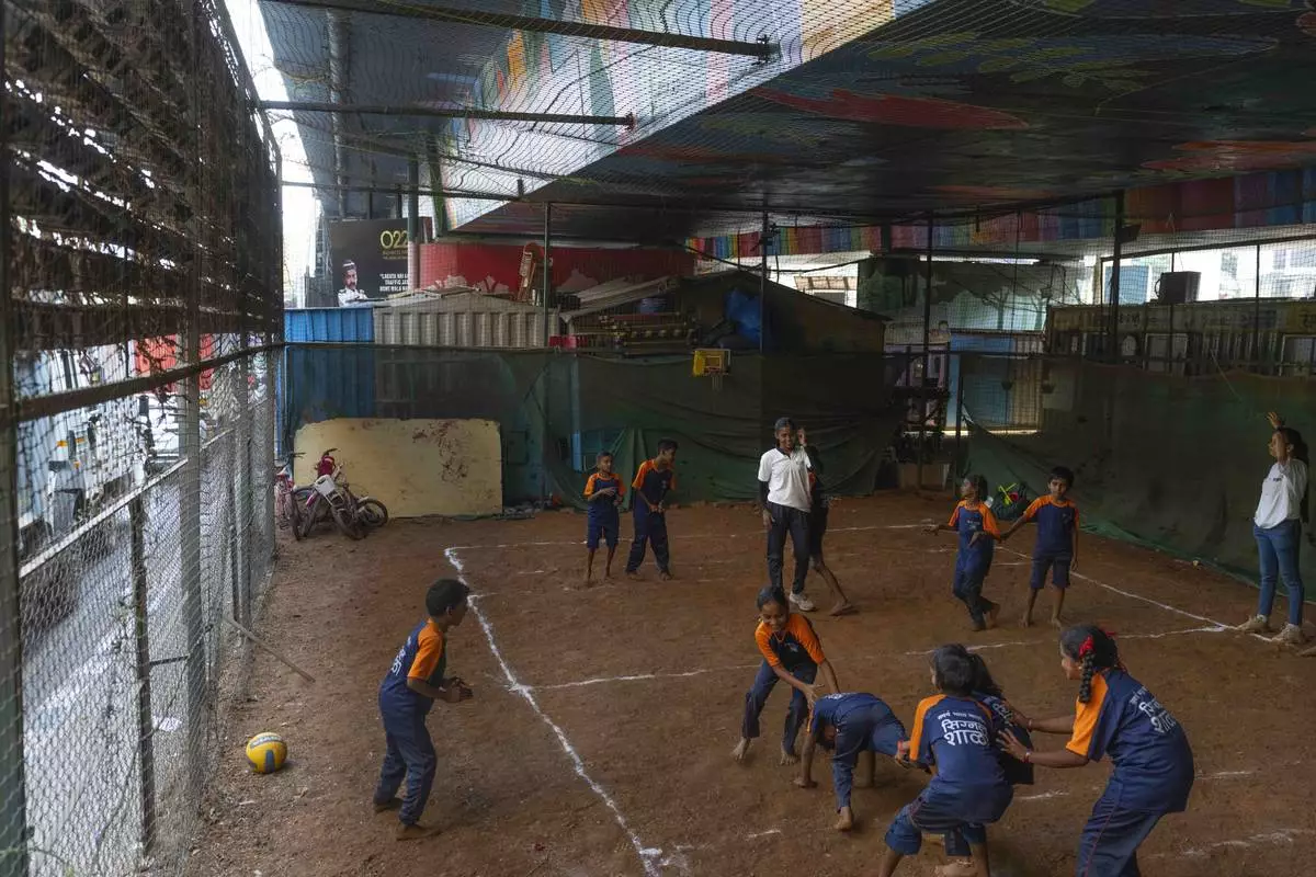 Students play kabbadi, a traditional Indian sport, at the Signal Shala school in Thane near Mumbai, India, April 3, 2025. (AP Photo/Rafiq Maqbool)