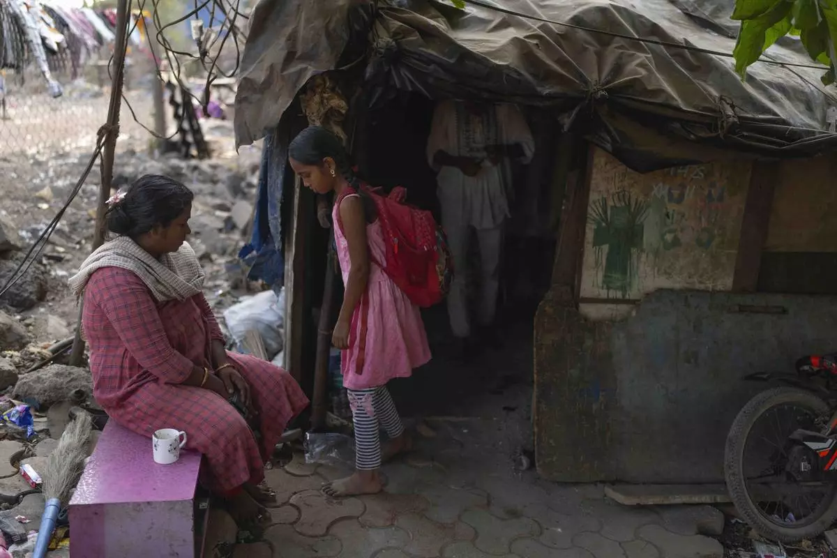 Unnati Pradeep, 11, talks to her mother outside her home in Thane near Mumbai, India, April 9, 2025. (AP Photo/Rafiq Maqbool)