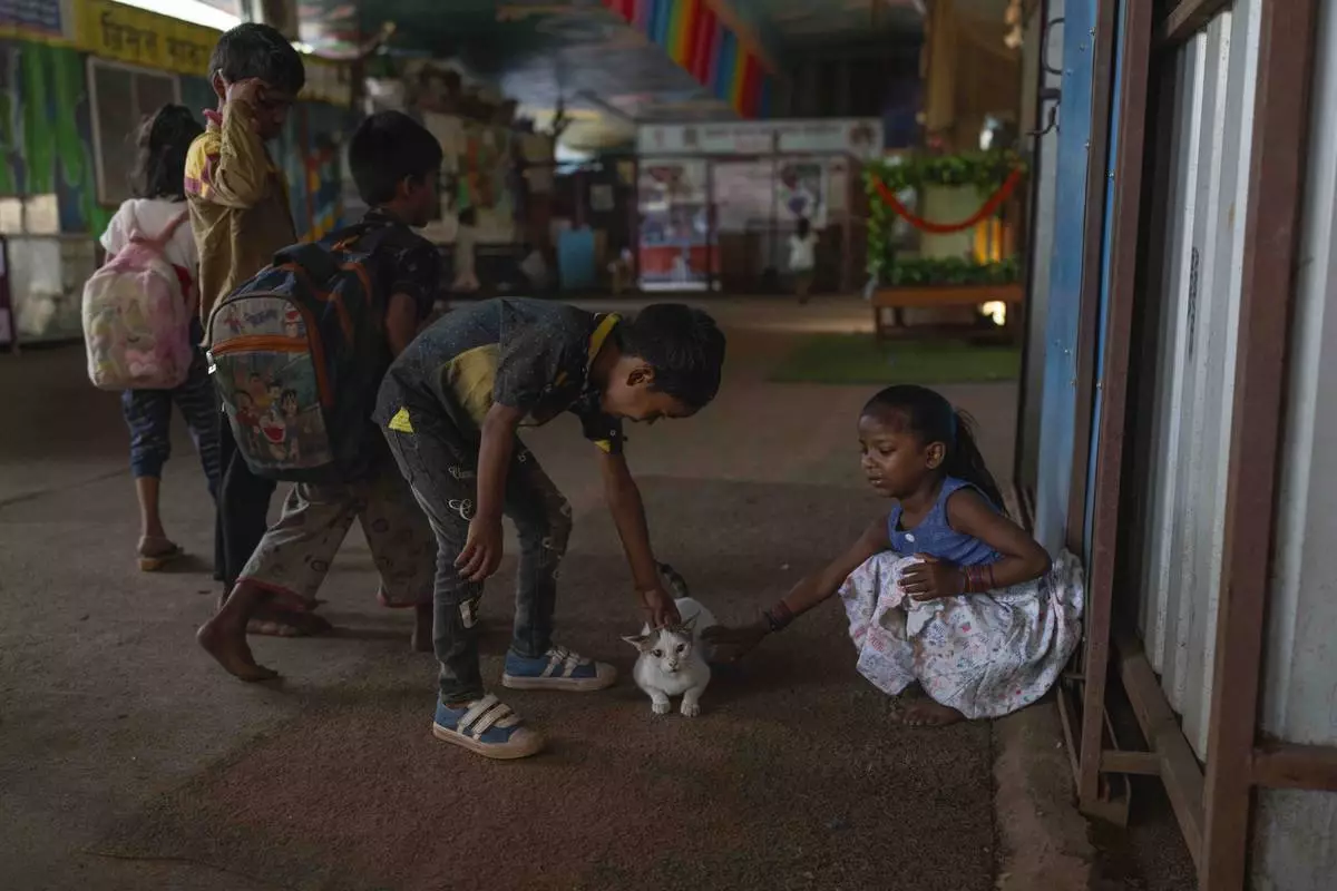 Children play with a kitten at the Signal Shala school in Thane near Mumbai, India, April 9, 2025. (AP Photo/Rafiq Maqbool)