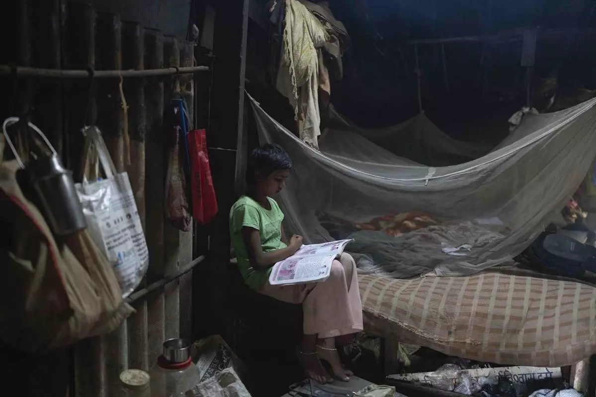 Neelam Krishan, 11, studies at her home in Thane near Mumbai, India, April 9, 2025. (AP Photo/Rafiq Maqbool)