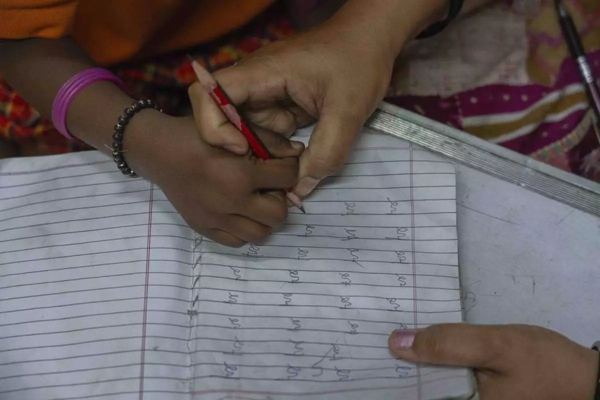A student studies the Marathi alphabet at the Signal Shala school in Thane near Mumbai, India, April 3, 2025. (AP Photo/Rafiq Maqbool)