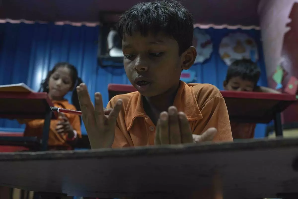 Yash Ganesh Gayakwad, 9, counts on his fingers during a math lesson at the Signal Shala school in Thane near Mumbai, India, April 9, 2025. (AP Photo/Rafiq Maqbool)