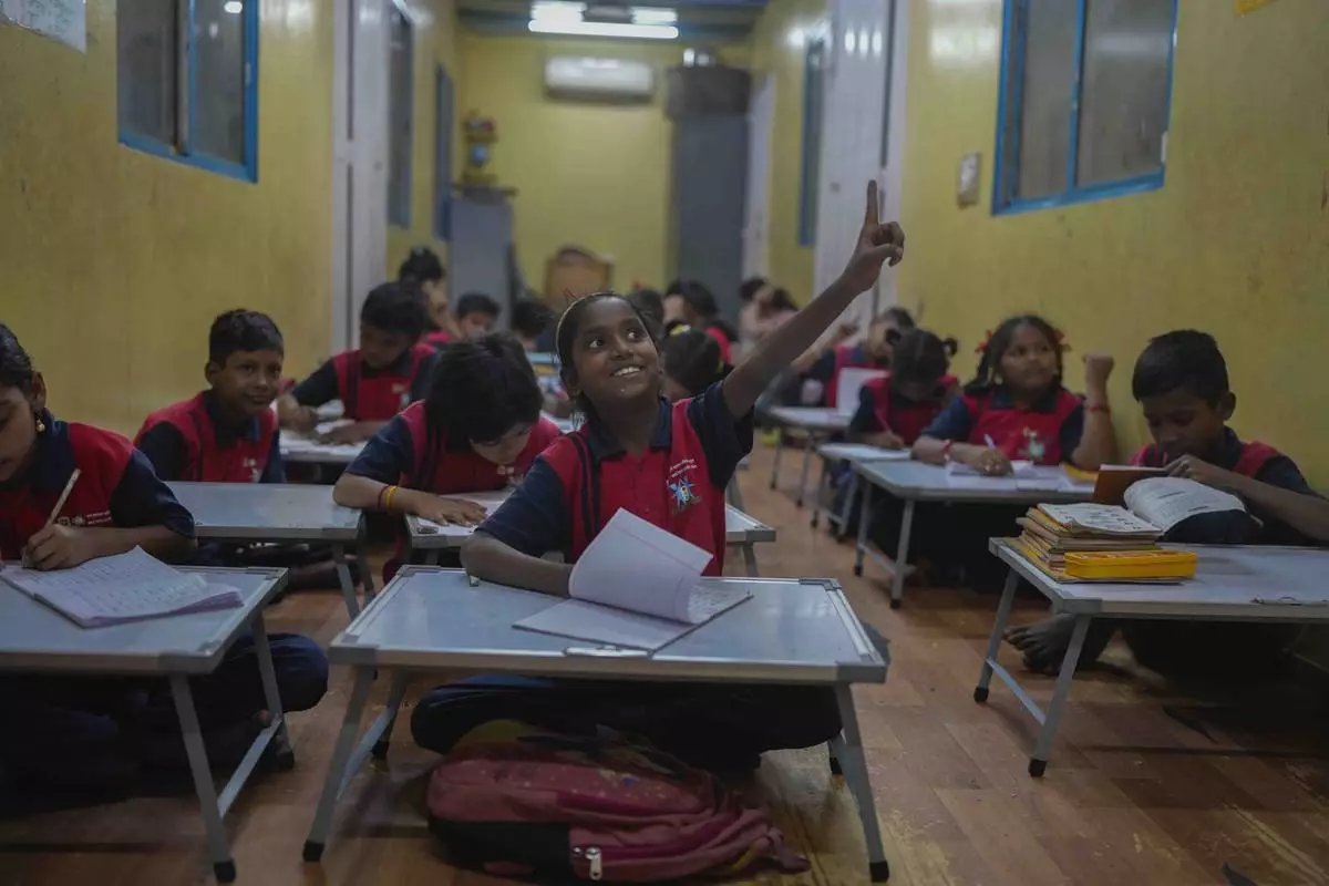 A student raises her hand during a lesson at the Signal Shala school in Thane near Mumbai, India, April 3, 2025. (AP Photo/Rafiq Maqbool)