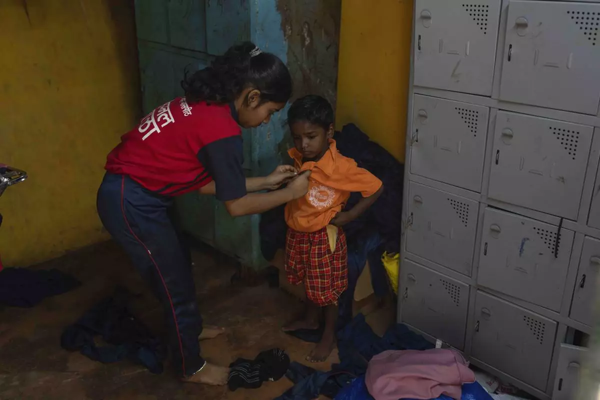 Sonali Goutam Gayakwad, 14, helps a young boy put his uniform on at the Signal Shala school in Thane near Mumbai, India, April 5, 2025. (AP Photo/Rafiq Maqbool)