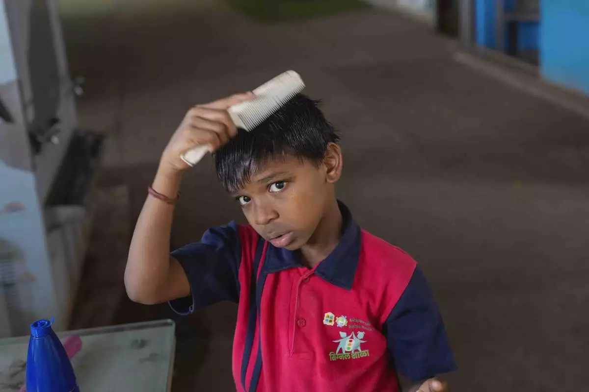 Yash Ganesh Gayakwad, 9, combs his hair after a shower at the Signal Shala school in Thane near Mumbai, India, April 5, 2025. (AP Photo/Rafiq Maqbool)