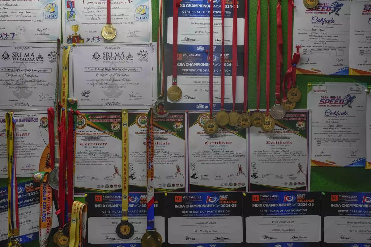 Medals and certificates won by students are displayed on a wall at the Signal Shala school in Thane near Mumbai, India, April 5, 2025. (AP Photo/Rafiq Maqbool)
