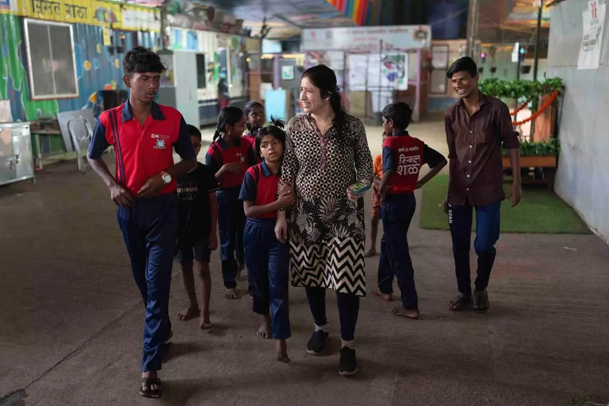 Teacher Shaila Desale, center, walks with her students during a break at the Signal Shala school in Thane near Mumbai, India, April 9, 2025. (AP Photo/Rafiq Maqbool)