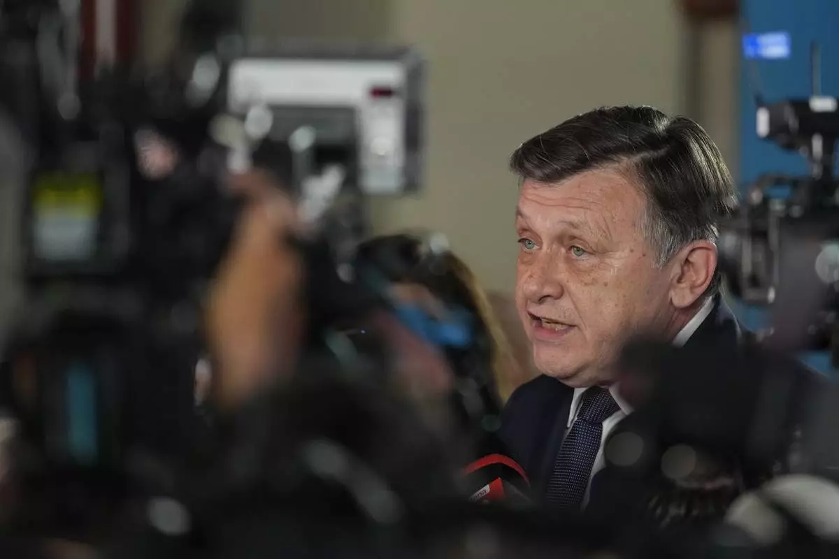FILE - Presidential candidate Crin Antonescu sits during a live electoral debate in Bucharest, Romania, Tuesday, April 29, 2025. (AP Photo/Vadim Ghirda, File)