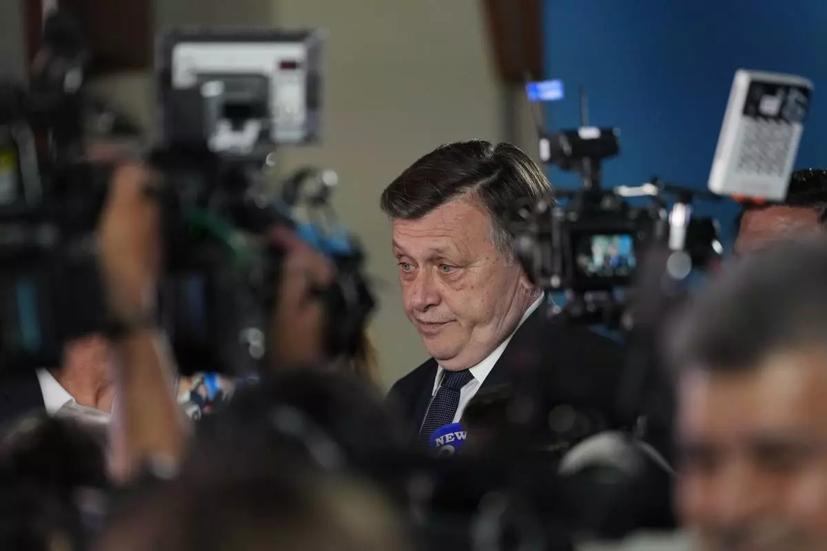 Presidential candidate Crin Antonescu speaks to media during a meeting with supporters after polls closed for the first round of the country's presidential election redo in Bucharest, Romania, Sunday, May 4, 2025. (AP Photo/Vadim Ghirda)