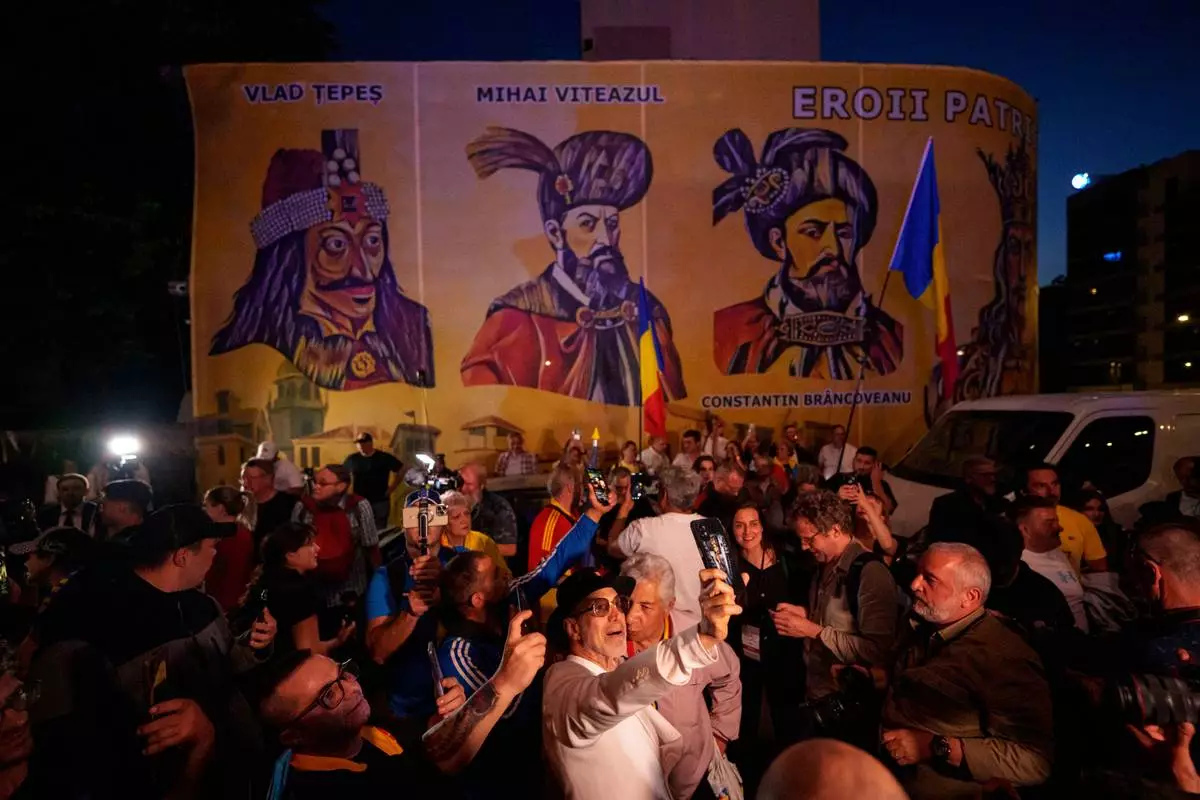 Supporters of presidential candidate George Simion react to the exit poll results, backdropped by depictions of Romanian historical figures, outside the headquarters of the Alliance for the Unity of Romanians (AUR) after polls closed for the first round of the country's presidential election redo in Bucharest, Romania, Sunday, May 4, 2025. (AP Photo/Andreea Alexandru)
