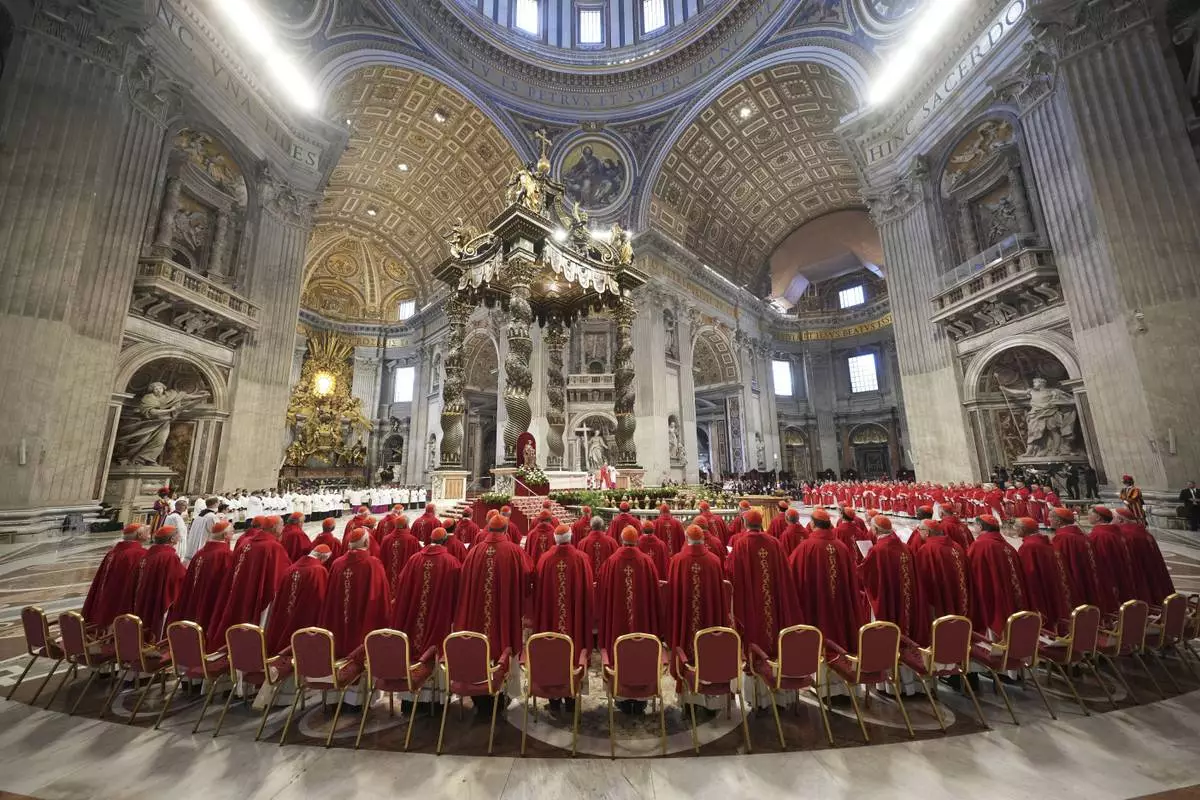 FILE - Cardinals attend a Mass on the fifth day of mourning for the late Pope Francis in St. Peter's Basilica at the Vatican, Wednesday, April 30, 2025. (AP Photo/Alessandra Tarantino, File)