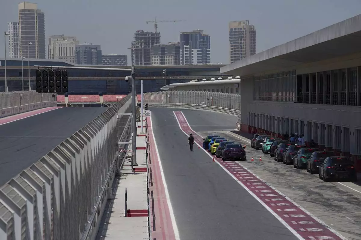 Supercars line up before the start of the first all-women rally in Dubai, United Arab Emirates, Thursday, May 1, 2025. (AP Photo/ Fatima Shbair)