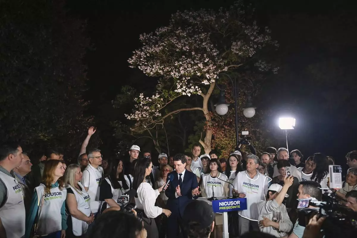 Presidential candidate Nicusor Dan speaks to media, surrounded by supporters, after polls closed in the first round of the country's presidential election redo in Bucharest, Romania, Sunday, May 4, 2025. (AP Photo/Eduard Vinatoru)