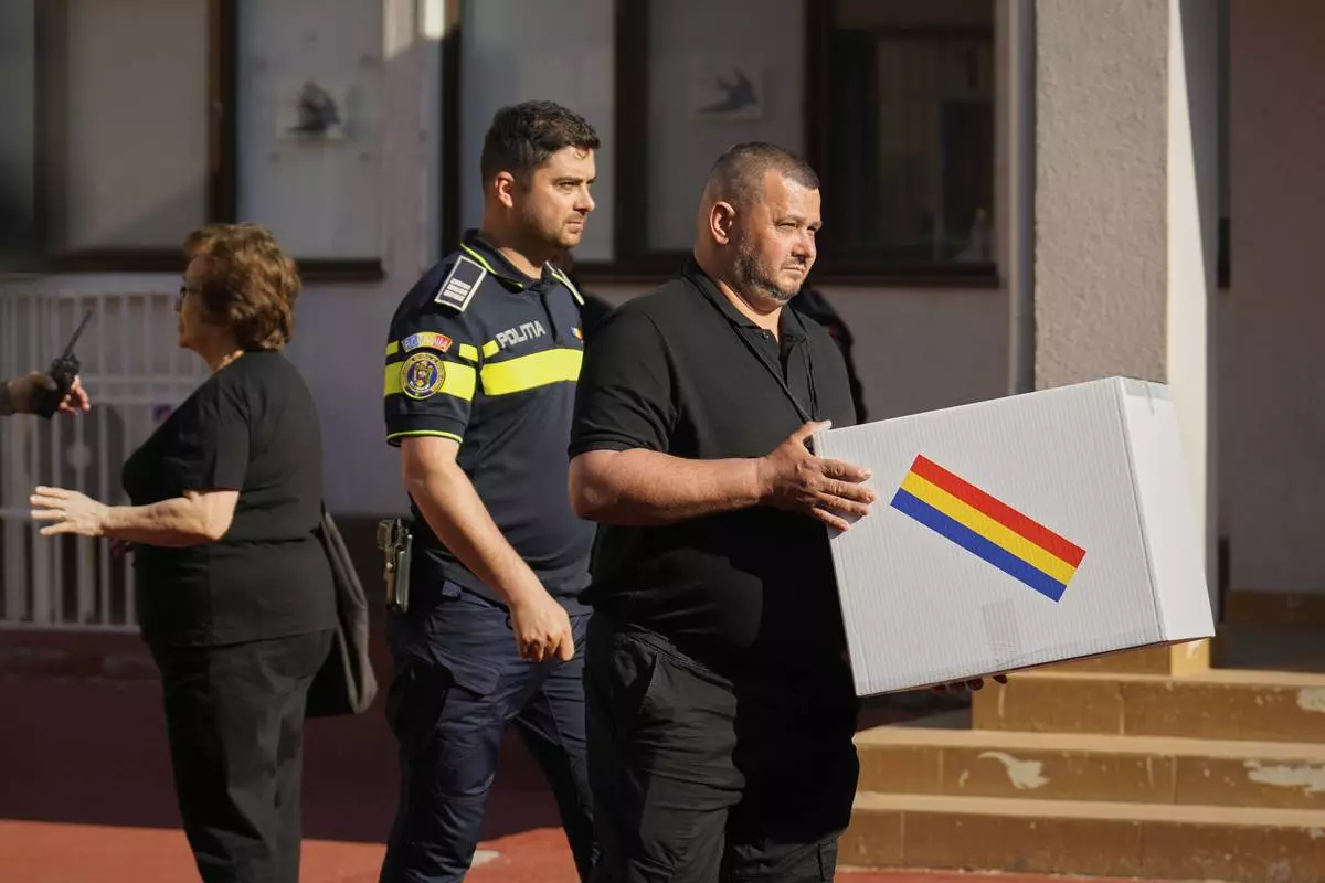 An election official carries a mobile ballot box outside a polling station during the first round of the presidential election redo in Bucharest, Romania, Sunday, May 4, 2025. (AP Photo/Vadim Ghirda)