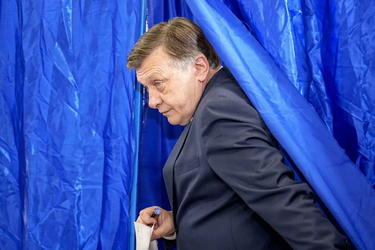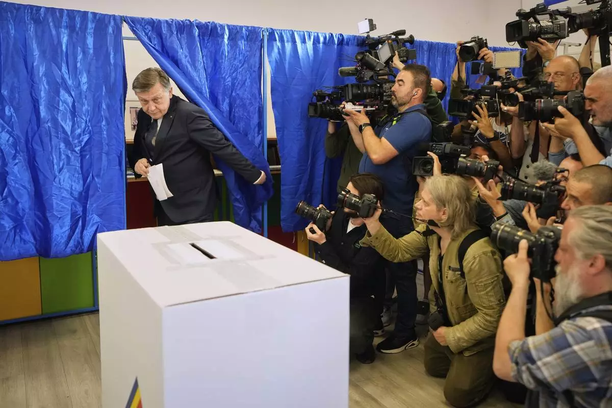 Presidential candidate Crin Antonescu exits a voting cabin before casting his vote in the first round of the presidential election redo in Bucharest, Romania, Sunday, May 4, 2025. (AP Photo/Vadim Ghirda)