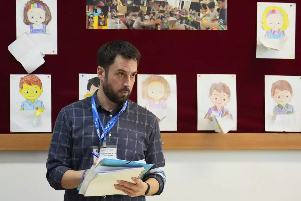 Eoghan Murphy, the head of the OSCE election monitoring delegation takes notes at a polling station during the first round of the presidential election redo in Bucharest, Romania, Sunday, May 4, 2025. (AP Photo/Vadim Ghirda)