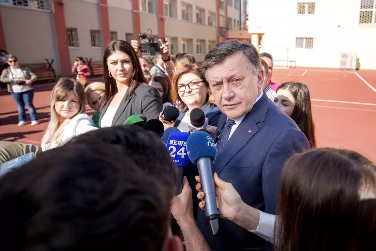 Presidential candidate Crin Antonescu speaks to media after casting his vote in the first round of the presidential election redo in Bucharest, Romania, Sunday, May 4, 2025. (AP Photo/Andreea Alexandru)