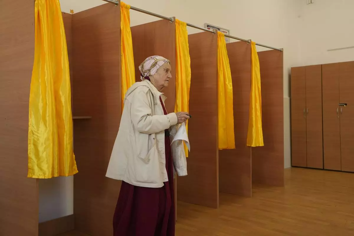 A woman exits a voting booth before casting her vote in the first round of the presidential election redo in Bucharest, Romania, Sunday, May 4, 2025. (AP Photo/Vadim Ghirda)