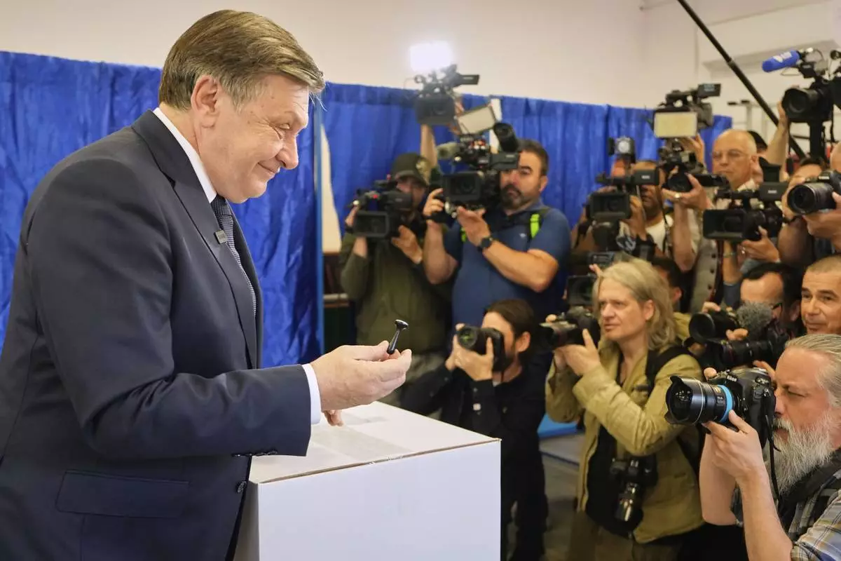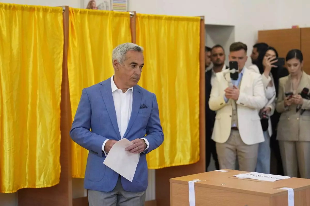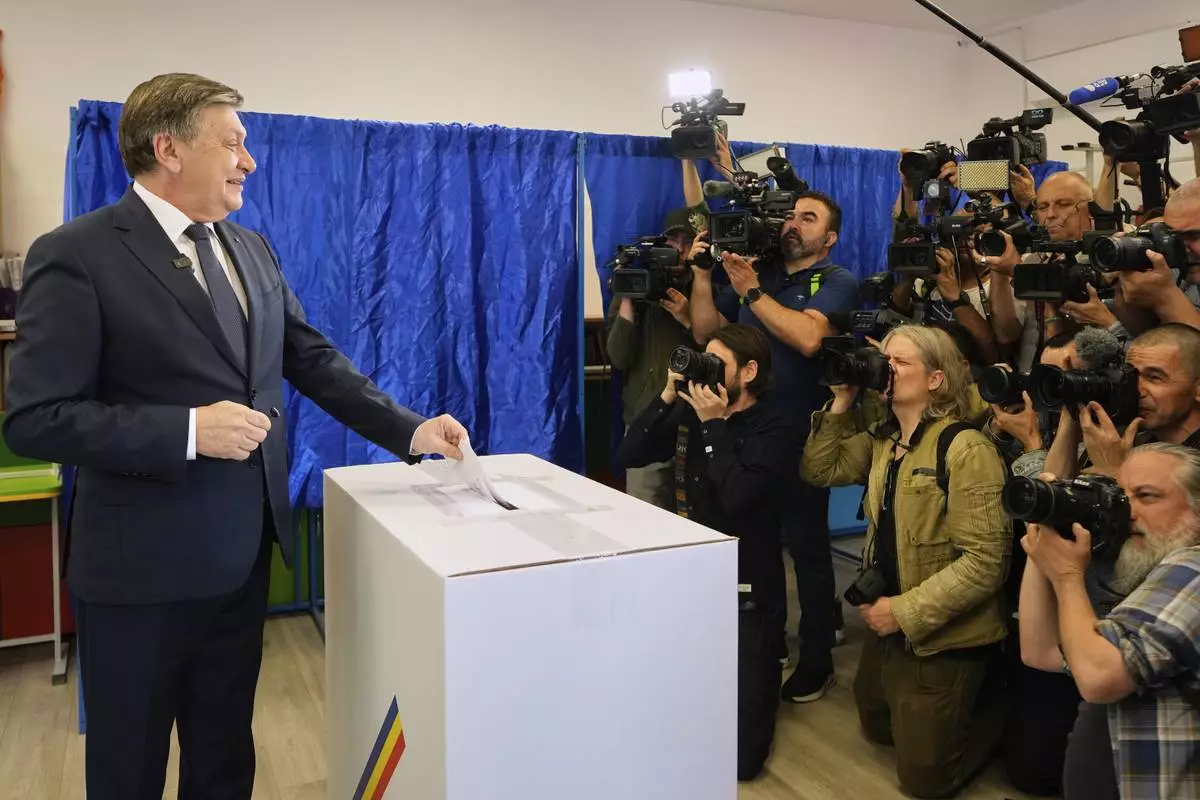 Presidential candidate Crin Antonescu casts his vote in the first round of the presidential election redo in Bucharest, Romania, Sunday, May 4, 2025. (AP Photo/Andreea Alexandru)