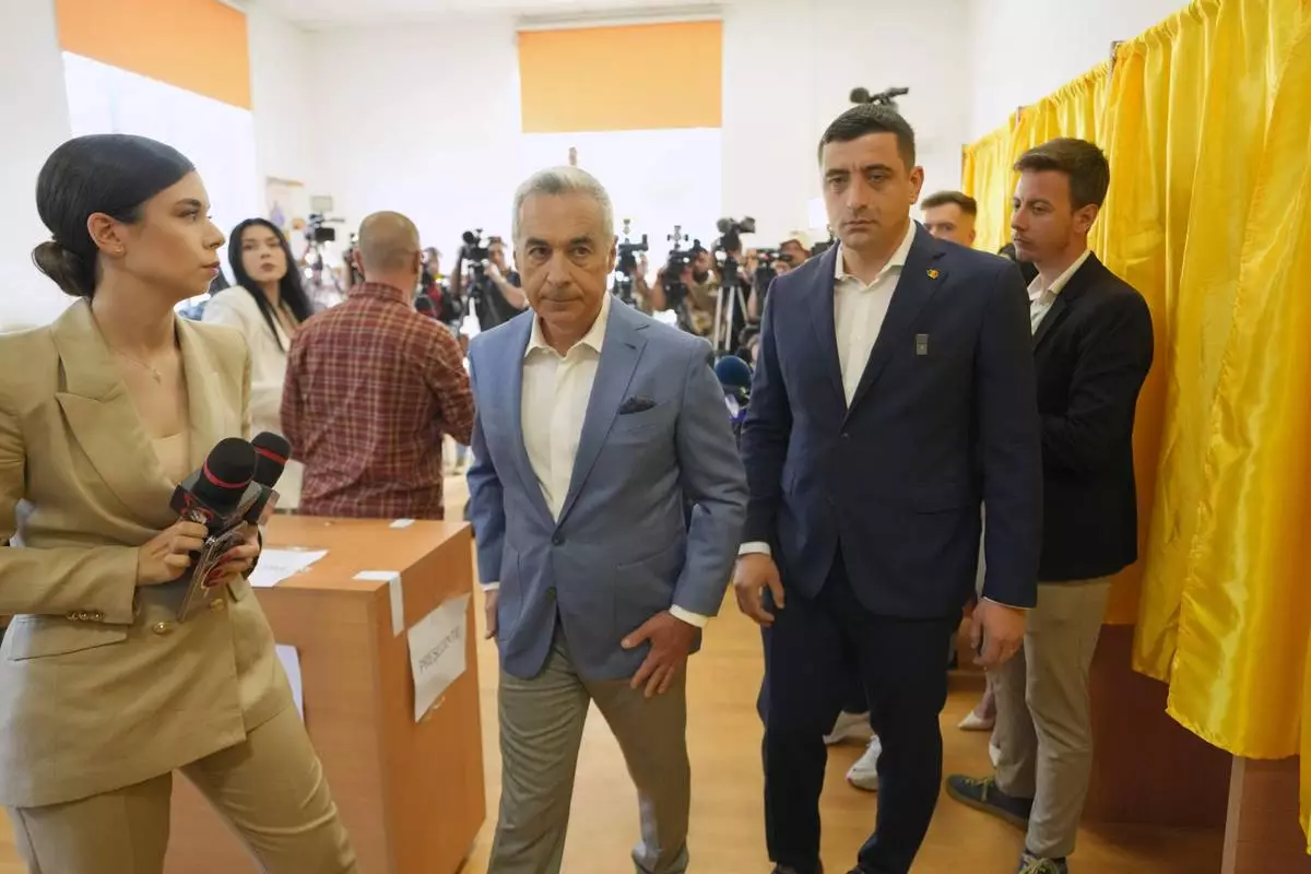 Calin Georgescu, winner of the first round of last year's annulled election, center left, and Presidential candidate George Simion exit after casting their votes in the first round of the presidential election redo in Bucharest, Romania, Sunday, May 4, 2025. (AP Photo/Vadim Ghirda)