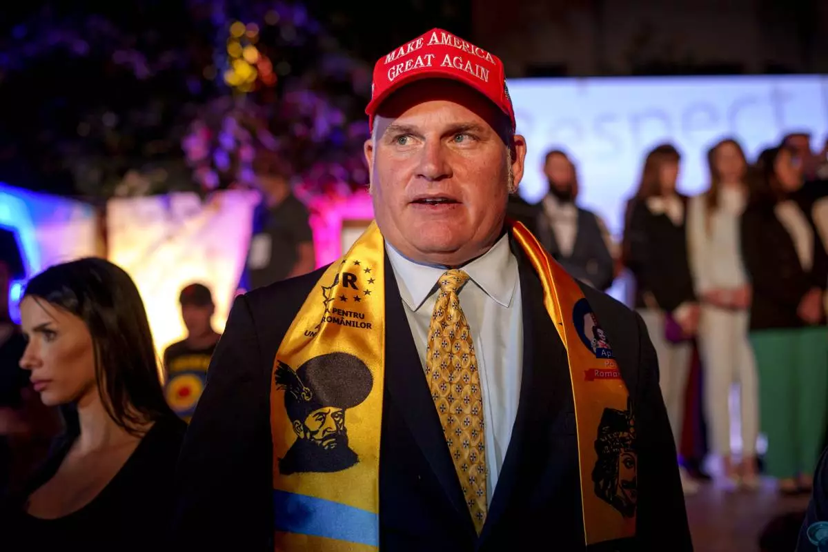 U.S. activist Brian Brown stands as supporters of presidential candidate George Simion celebrate the exit poll results at the headquarters of the Alliance for the Unity of Romanians (AUR) after polls closed for the first round of the country's presidential election redo in Bucharest, Romania, Sunday, May 4, 2025. (AP Photo/Andreea Alexandru)