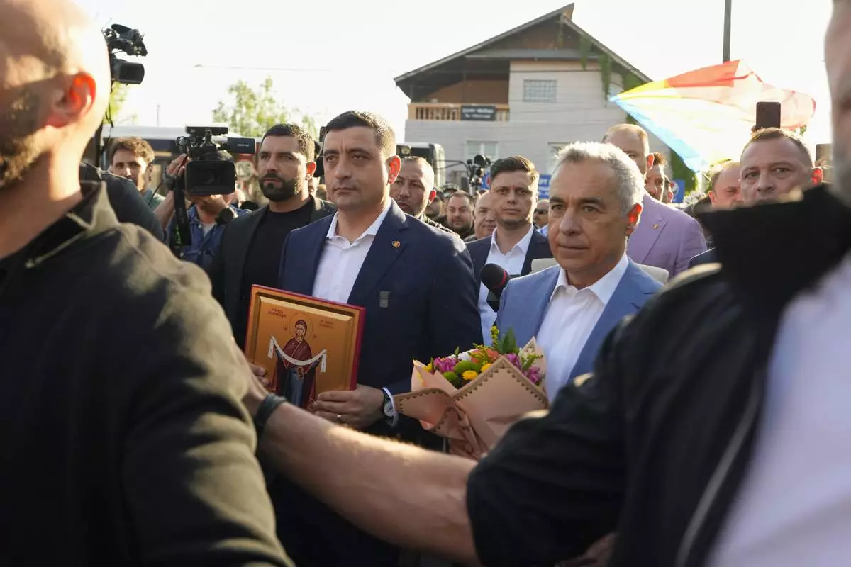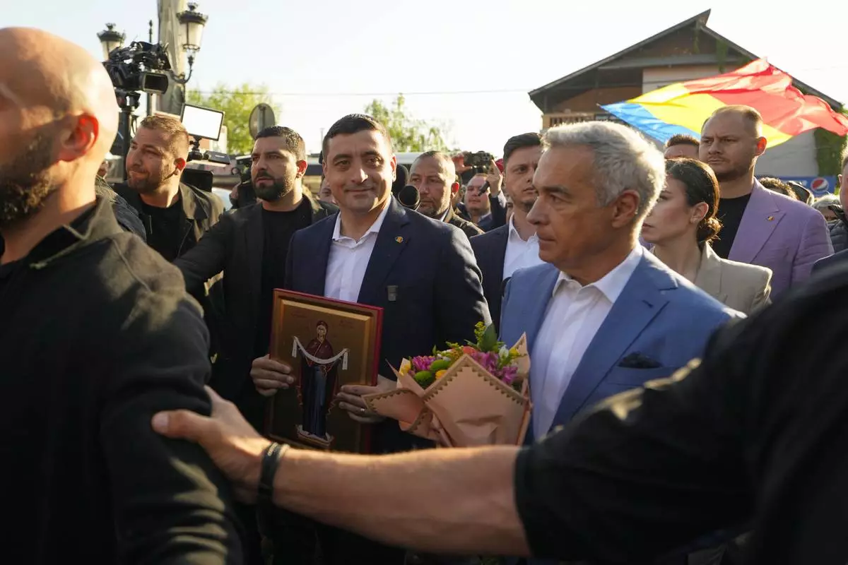 Presidential candidate George Simion, left, holds a religious icon as he walks with Calin Georgescu, winner of the first round of last year's annulled election, after casting their votes in the first round of the presidential election redo in Bucharest, Romania, Sunday, May 4, 2025. (AP Photo/Vadim Ghirda)