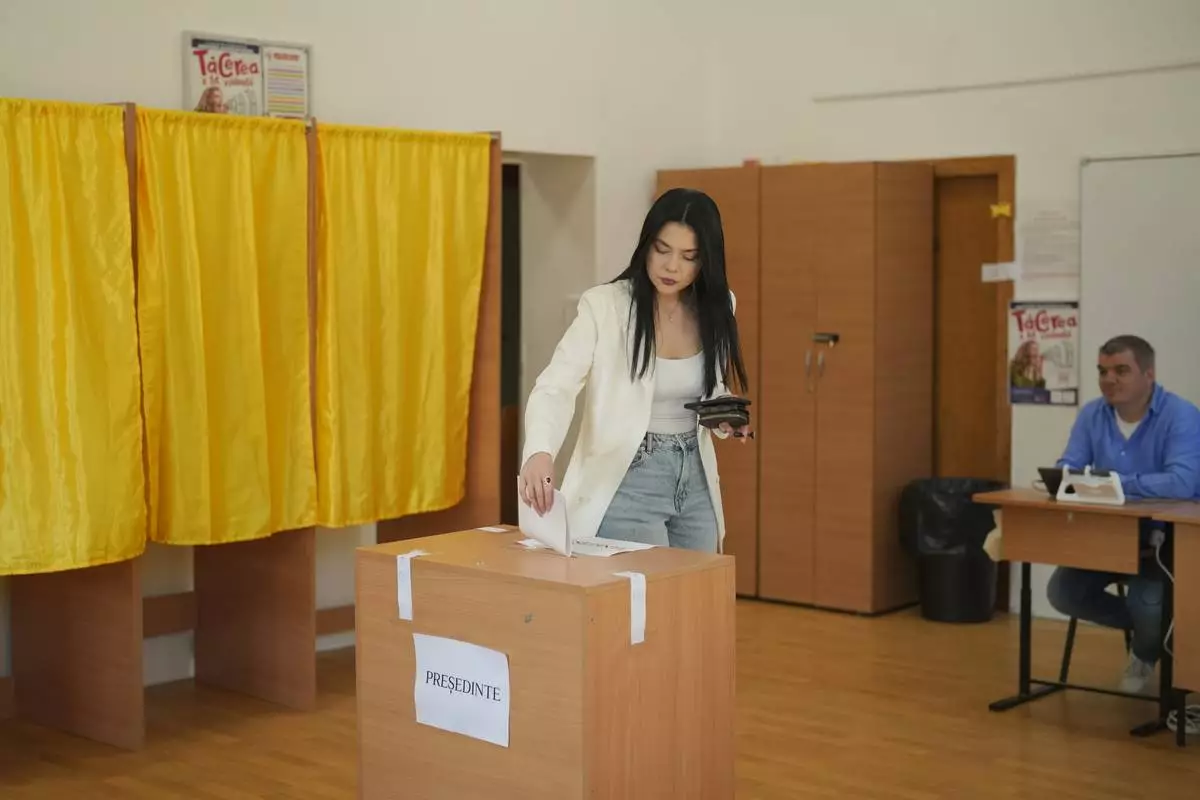 A woman casts her vote in the first round of the presidential election redo in Bucharest, Romania, Sunday, May 4, 2025. (AP Photo/Vadim Ghirda)