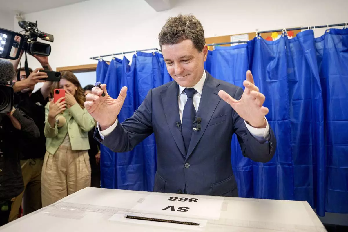 Presidential candidate Crin Antonescu returns the stamp he used for voting in the first round of the presidential election redo in Bucharest, Romania, Sunday, May 4, 2025. (AP Photo/Vadim Ghirda)
