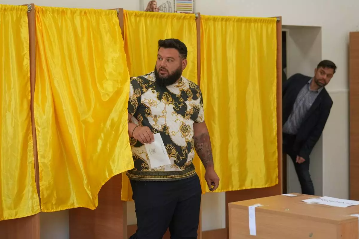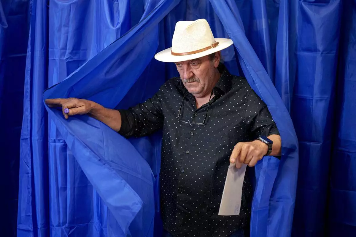 A man exits a voting booth before casting his vote in the first round of the presidential election redo in Bucharest, Romania, Sunday, May 4, 2025. (AP Photo/Vadim Ghirda)