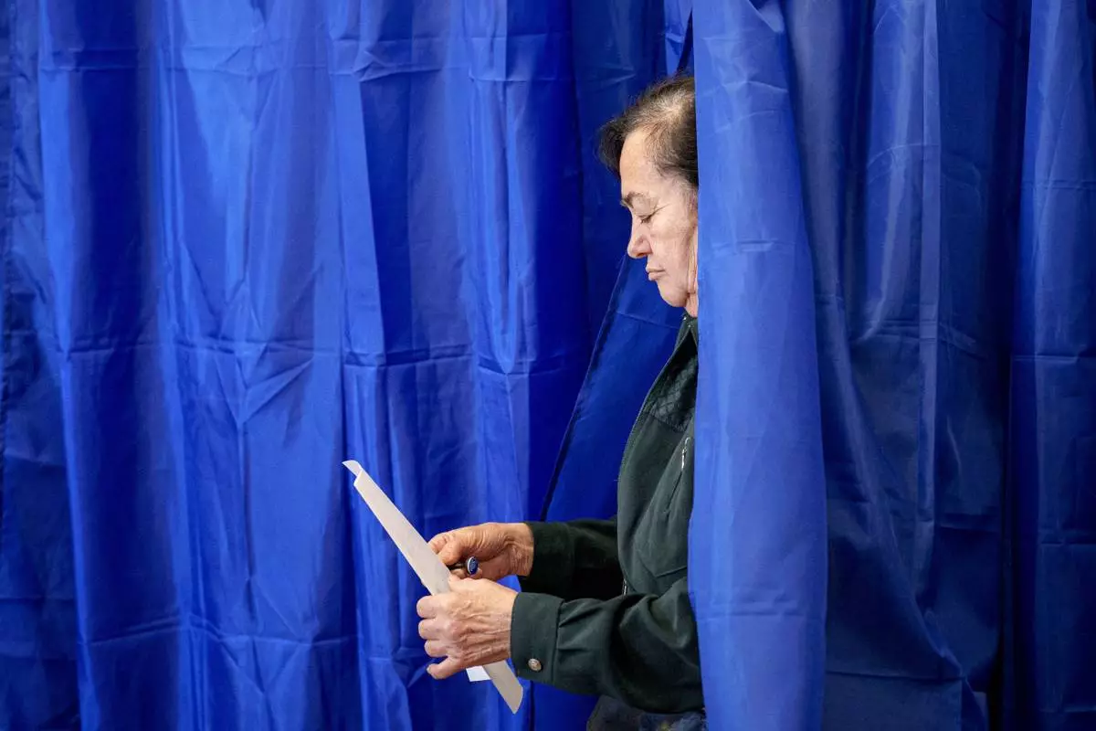 A woman exits a voting booth before casting her vote in the first round of the presidential election redo in Bucharest, Romania, Sunday, May 4, 2025. (AP Photo/Andreea Alexandru)