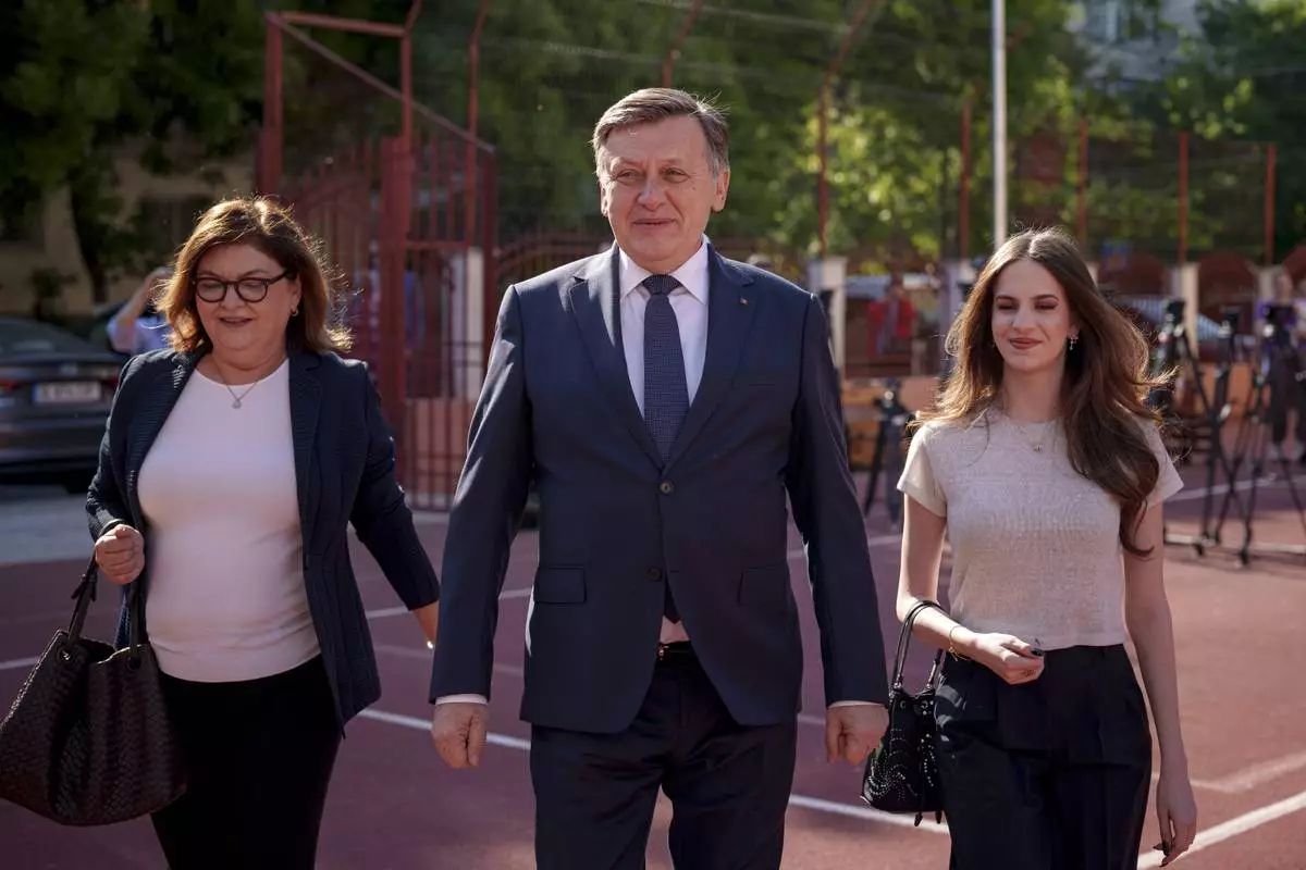 Presidential candidate Crin Antonescu walks with his wife, Adina Valean and daughter Irina, right, after voting in the first round of the presidential election redo in Bucharest, Romania, Sunday, May 4, 2025. (AP Photo/Vadim Ghirda)