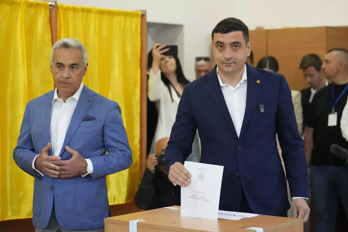 Presidential candidate George Simion, right, casts his vote next to Calin Georgescu, winner of the first round of last year's annulled election, during the first round of the presidential election redo in Bucharest, Romania, Sunday, May 4, 2025. (AP Photo/Vadim Ghirda)