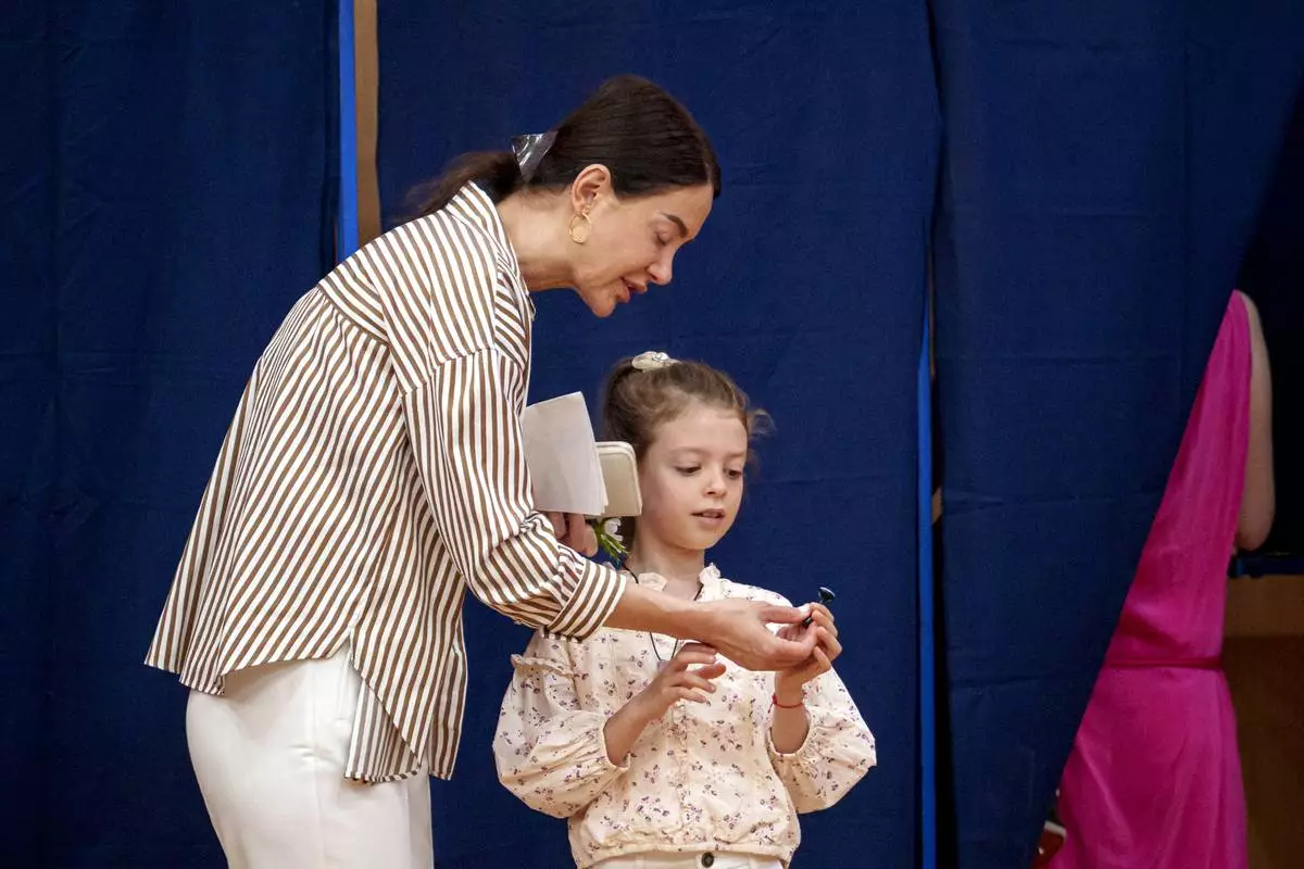 A woman hands a little girl a voting stamp after exiting a voting booth before casting her vote in the first round of the presidential election redo in Bucharest, Romania, Sunday, May 4, 2025. (AP Photo/Andreea Alexandru)