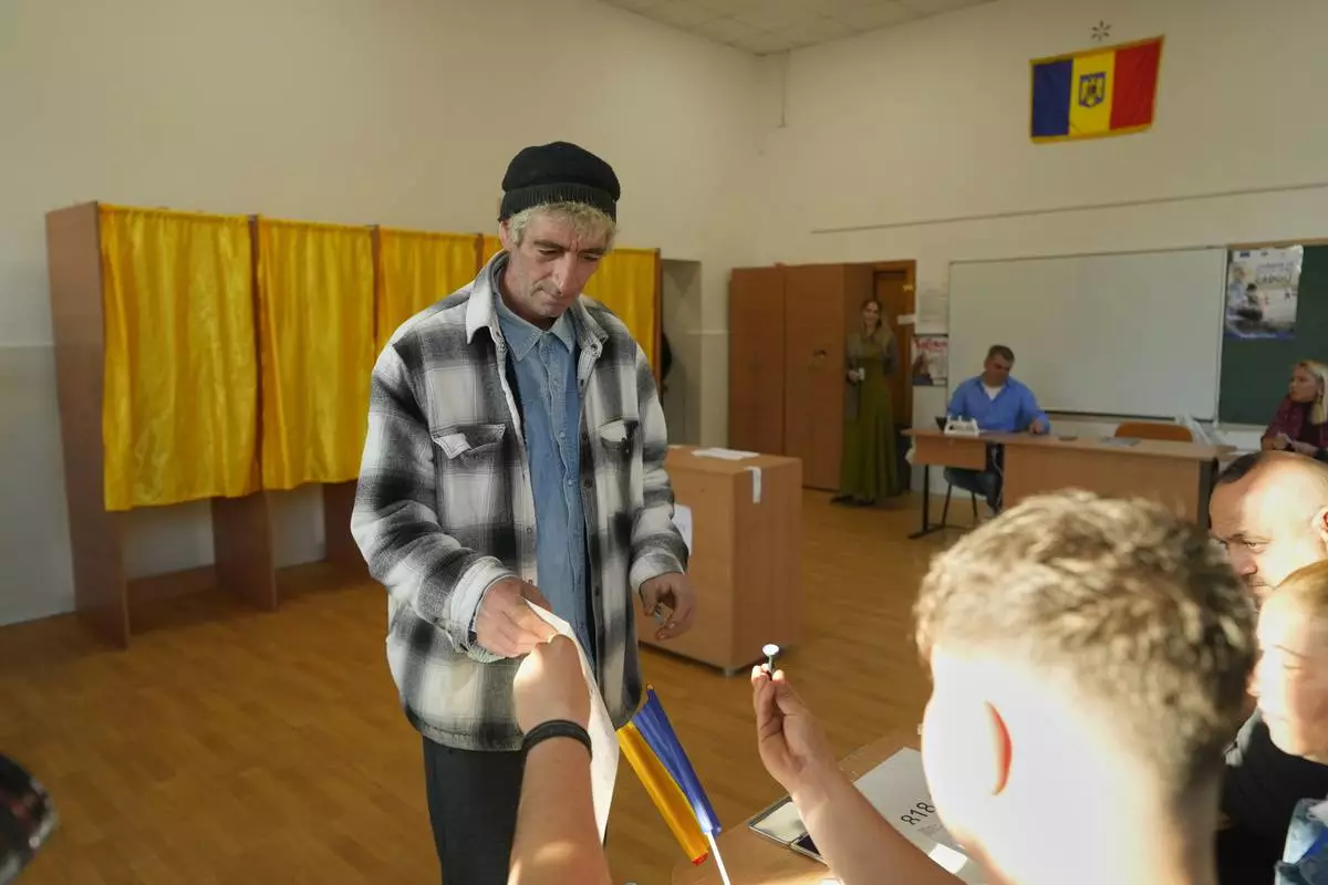 A man receives a voting stamp before casting his vote in the first round of the presidential election redo in Bucharest, Romania, Sunday, May 4, 2025. (AP Photo/Vadim Ghirda)