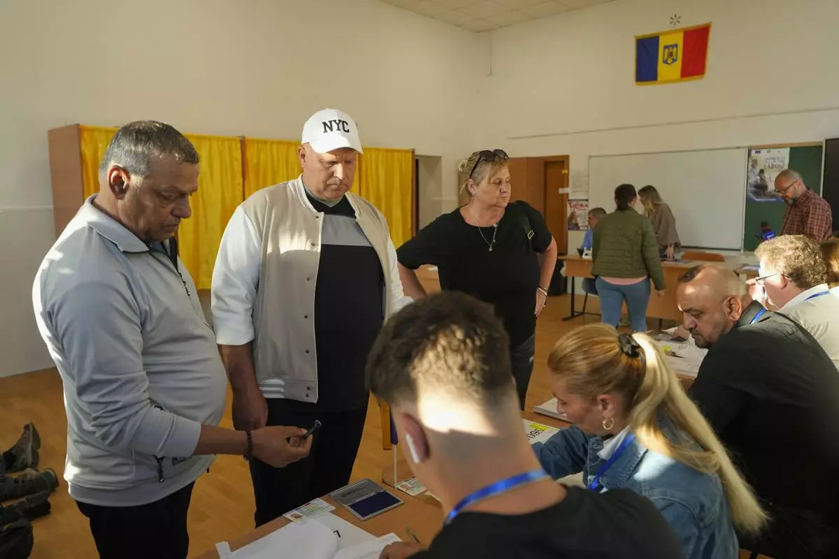 People register before voting in the first round of the presidential election redo in Bucharest, Romania, Sunday, May 4, 2025. (AP Photo/Vadim Ghirda)