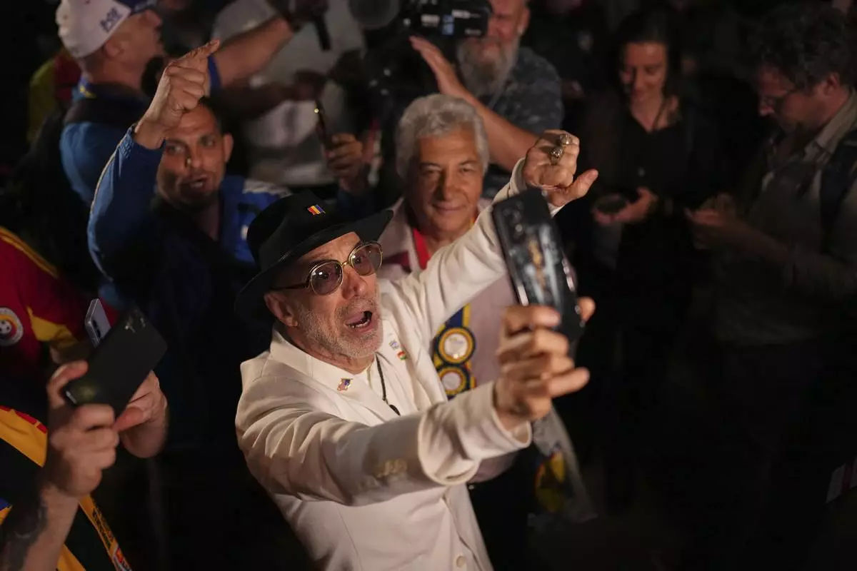 Supporters of Presidential candidate George Simion react to the exit poll results during the first round of the country's presidential election redo in Bucharest, Romania, Sunday, May 4, 2025. (AP Photo/Andreea Alexandru)