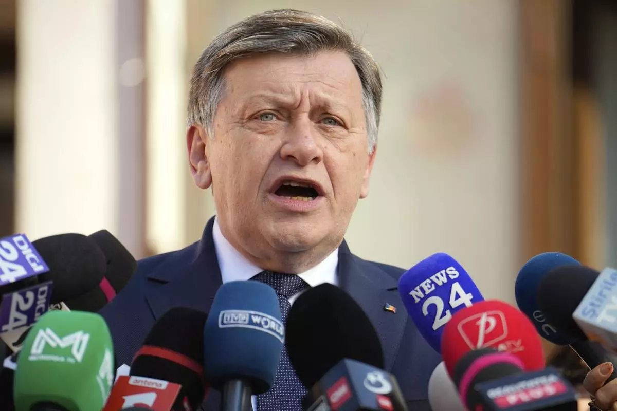 Presidential candidate Crin Antonescu speaks to media after voting in the first round of the presidential election redo in Bucharest, Romania, Sunday, May 4, 2025. (AP Photo/Vadim Ghirda)