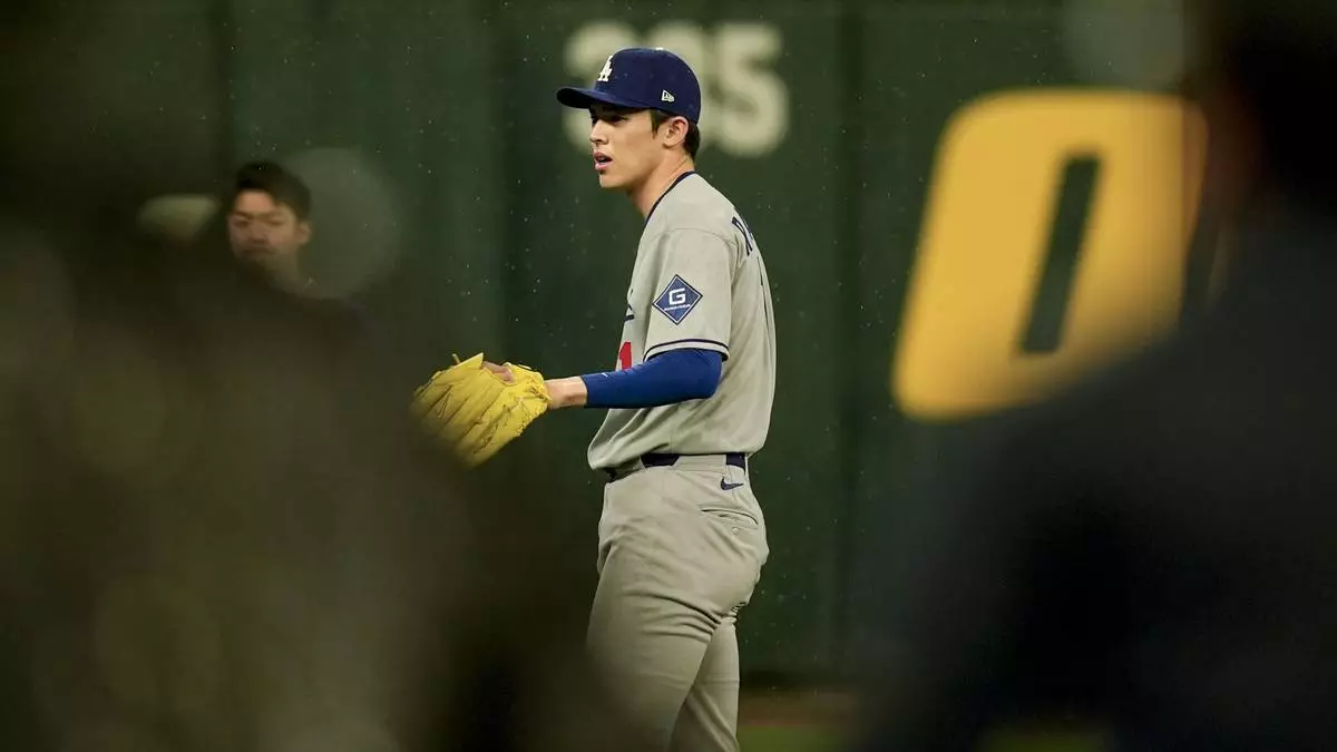 Los Angeles Dodgers pitcher Roki Sasaki warms up in the rain as ground crew removes the tarp ahead of a baseball game between the Atlanta Braves and the Los Angeles Dodgers, Saturday, May 3, 2025, in Atlanta. (AP Photo/Mike Stewart)