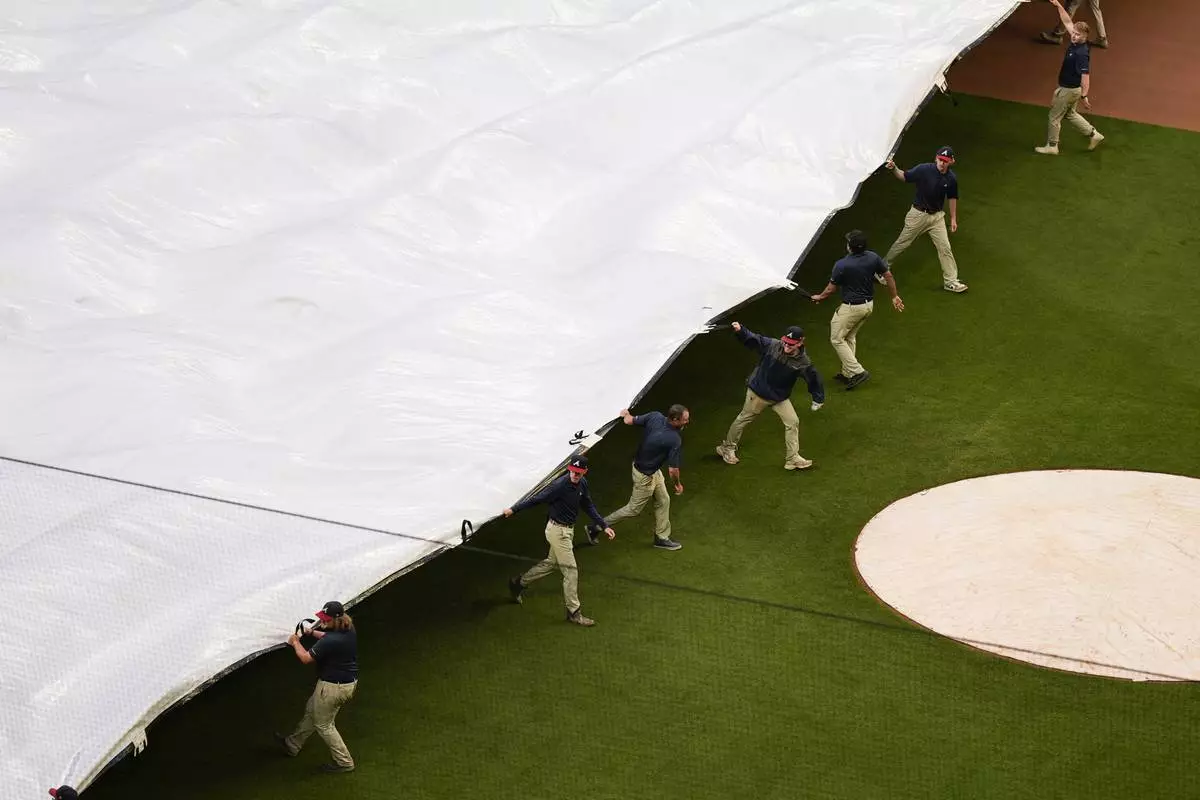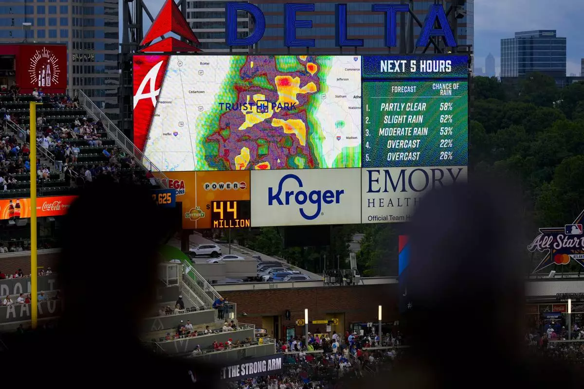 Rain and lightning led to a delay of 3 hours, 6 minutes, before the first pitch. The 10:21 p.m. start was the latest in Truist Park’s nine-year history. The game ended at 1:26 a.m. Sunday.